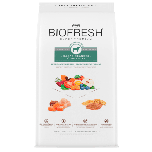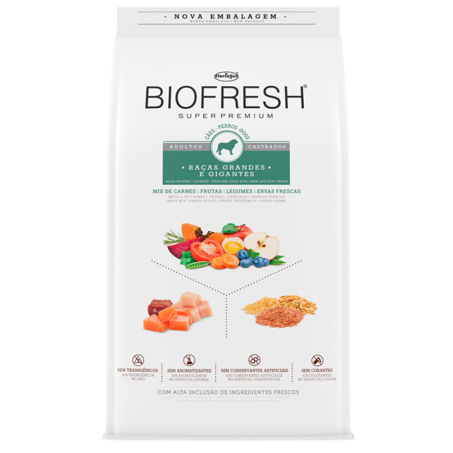 Biofresh Super Premium es innovador y diferente, porque tiene lta inclusión de ingredientes realmente frescos, directamente de la naturaleza. El resultado es un alimento completo y equilibrado que se destaca por elevar la nutrición de los perros castrados de razas medianas a su más alto nivel. Biofresh Super Premium Castrados ayuda a controlar el hambre entre las comidas y a mantener el peso corporal ideal, características muy importantes para preservar la salud después de la castración. La tecnología Biofresh garantiza la conservación de este alimento de forma 100% natural y segura, sin conservantes artificiales añadidos.