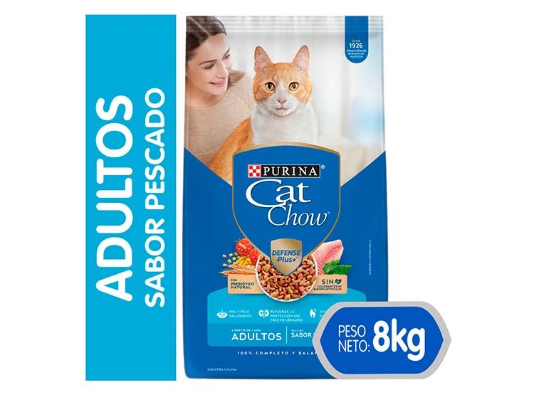 Alimento para gatos adultos de todos los tamaños CAT CHOW® Pescado. Ayuda a reducir el cúmulo de sarro. Con prebiótico natural. Sin colorantes ni sabores artificiales. 100% completo y balanceado. En formato de 8kg.